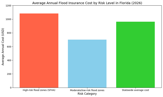 Flood insurance premiums are primarily influenced by the flood zone in which your property is located. Homes in high-risk flood zones generally pay more for flood insurance due to the increased risk. On the other hand, homes in lower-risk zones may pay less. In 2026, the average annual cost for flood insurance in Florida is around $964, with costs ranging from $700 for properties in lower-risk areas to over $1,083 for homes in high-risk zones. It’s important to assess your flood risk and evaluate different policy options to find a plan that fits your budget and coverage needs.