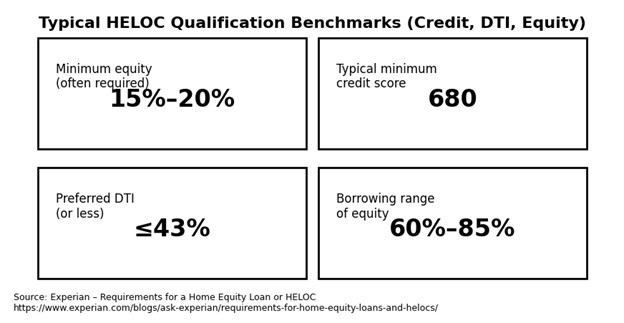 - A HELOC is not approved on score alone. Equity, DTI, and documentation drive the decision.