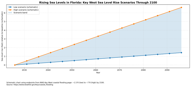 For the Florida Keys, local sea level projections for Key West span a wide range by 2100—roughly 1.5 feet to about 7 feet, depending on the scenario.