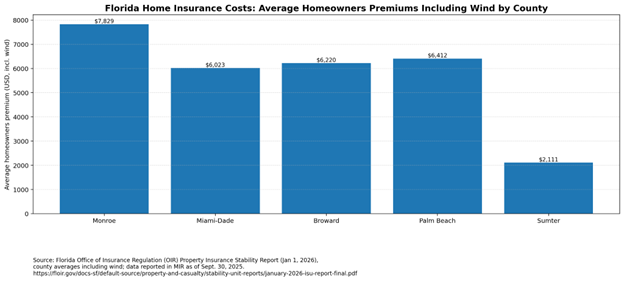 Risk exposure and market conditions differ. Florida’s Office of Insurance Regulation shows large county-to-county differences in average premiums (including wind coverage).