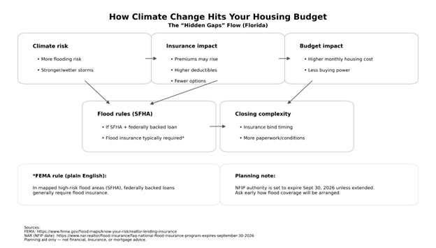 When climate risk pushes up insurance costs—or triggers required flood coverage—your budget can tighten even if the home price doesn’t change.